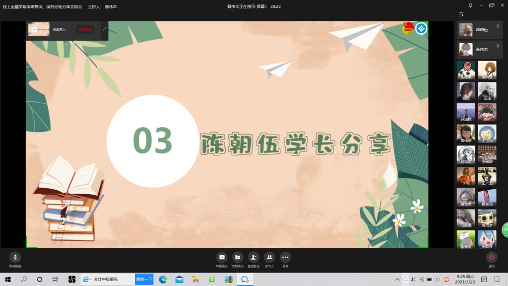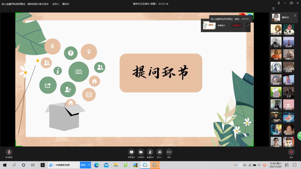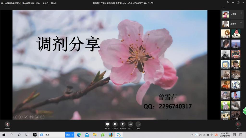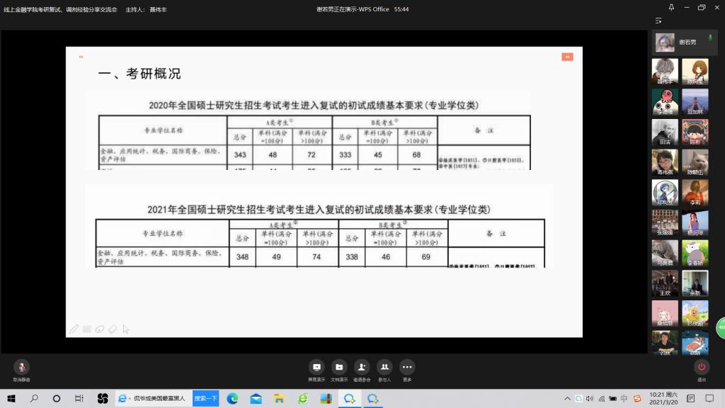 3月20日上午9:30,澳门信誉最好十大平台成功举行了“澳门信誉最好十大平台考研复试、调剂经验分享”线上交流会。此次交流会邀请了2020届考研成功的五位校友:杨润琼、陈朝伍、曾雪萍、刘柯岚、谢若男来分享关于复试和调剂成功的相关经验,为同学们答疑解惑。澳门信誉最好十大平台党委书记、副院长王建明,党委副书记、纪委书记余新出席了本次交流会。