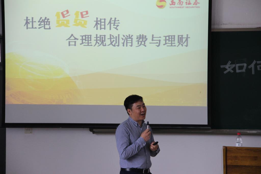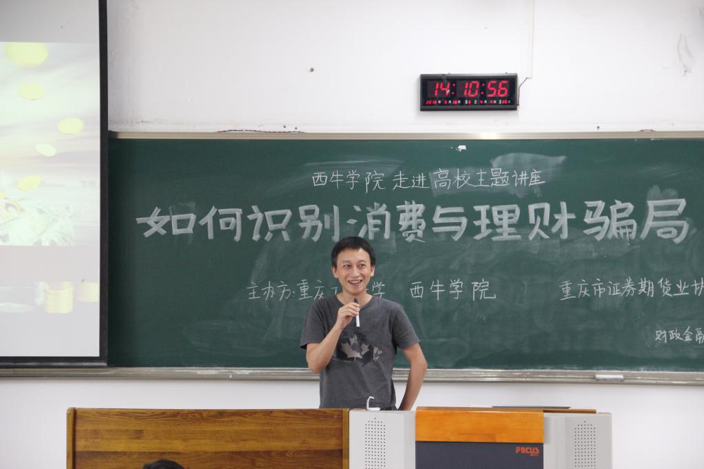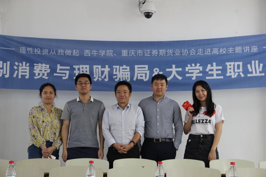 为使大学生了解金融市场风险、提高识别金融骗局的能力,同时为大学生提供就业规划、职业发展的指导与建议,5月18日下午2点,西南证券国家级互联网投教基地“西牛学院”、重庆市证券期货业协会和澳门十大信誉网赌大全财政澳门信誉最好十大平台在博智楼207联合举办了“如何识别消费与理财骗局暨大学生职业发展交流”的主题讲座。西南证券财富管理中心副总经理张涛、西南证券财富管理中心产品经理黄立龙、重庆市证券期货业协会培训部主任朱佳、财政澳门信誉最好十大平台分党委副书记黄谦以及学团办主任兰丽娟作为嘉宾莅临了本次讲座。