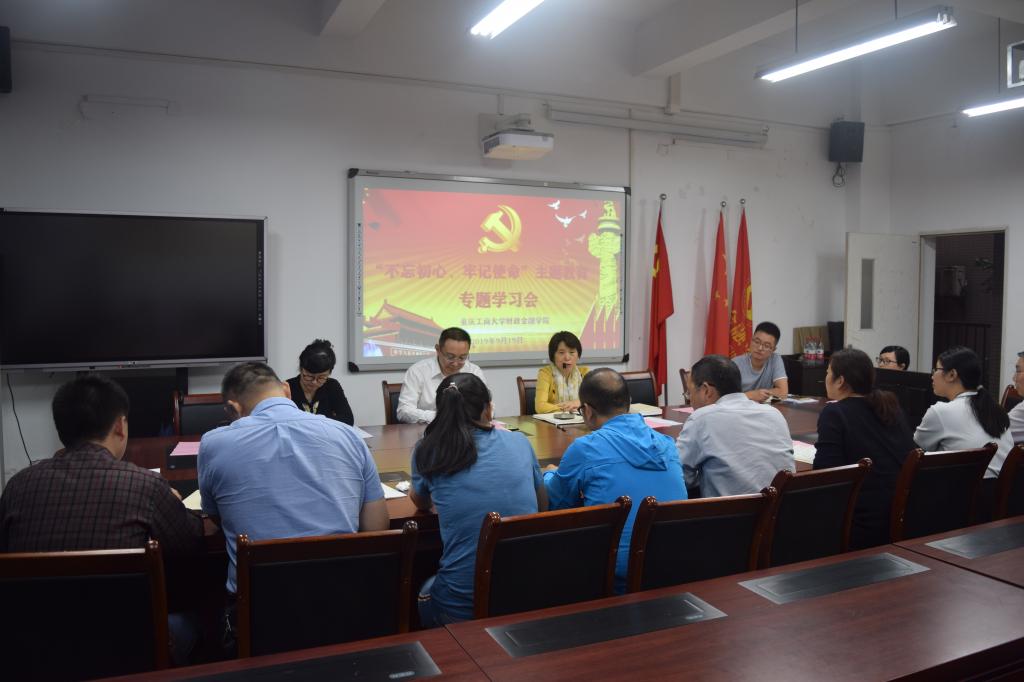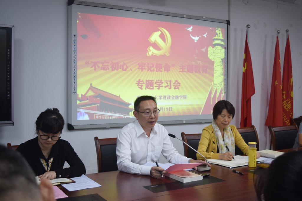 按照校党委“不忘初心、牢记使命”主题教育工作安排,9月19日,财政澳门信誉最好十大平台召开了“不忘初心、牢记使命”主题教育专题学习会暨第一次集中学习研讨会。校 “不忘初心、牢记使命”主题教育巡回指导二组副组长、校党委宣传部部长华杰同志亲临会议现场进行监督指导,学院领导班子全体成员、各支部书记参加了会议。会议由院党委书记杨萍同志主持。