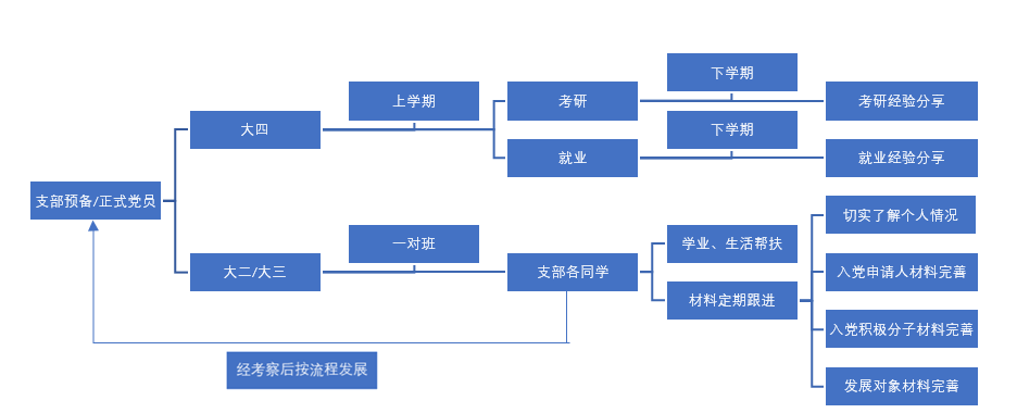 新形势下,澳门信誉最好十大平台学生二支部首次创新“党员学长制”制度,使入党流程形成规范化、程序化、透明化管理,通过大二、大三党员“一对一”、“一对多”的分配模式,开展以全体澳门信誉最好十大平台学生班级为单位的“学业帮扶”、“入党材料跟进”活动。同时,“党员学长制”定期开展“大四党员学长考研就业分享会”,深入践行入党初心,为群众办实事的使命。