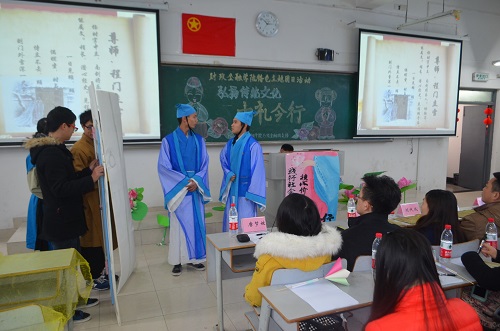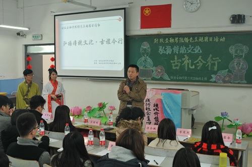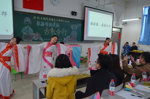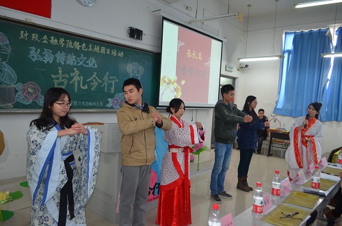 为培育和践行社会主义核心价值观,提升学生人文道德素养,财政澳门信誉最好十大平台2013级金融四支部于2014年12月18日下午在博智楼406教室举办了“弘扬传统文化——古礼今行”特色主题团日活动。财政澳门信誉最好十大平台党总支刘代成副书记、分团委书记兰丽娟老师、辅导员谭会敏老师以及校团委学生会组织部成员、财政澳门信誉最好十大平台分团委学生会主席团成员作为嘉宾莅临活动现场。