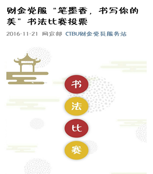 为了表达我们对党的热爱,学习习近平总书记的讲话,激发大生这一先进群体的爱国爱党热情,加强大学生群体的党性素养。也为了在我们学生群体引导提倡书写,用笔尖书写中华汉字之美,渲染一种文化氛围,充分调动学生群体参与活动的积极性,澳门十大信誉网赌大全财金学院党员服务站于2016年11月15日至12月9日举办了以“笔墨香,书写你的美”为主题的线上书法比赛活动。