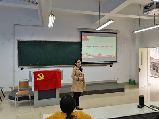 4月23日下午,副校长柏群在田家炳306教室为澳门信誉最好十大平台师生党员讲授题为《历史转折:十一届三中全会与改革开放》的党史学习教育专题党课。澳门信誉最好十大平台党委书记王建明、党委副书记余新、副院长庞楷、专职组织员赵甫刚、支部书记、行政人员和学生党员共计80余人参加了学习。会议由王建明主持。