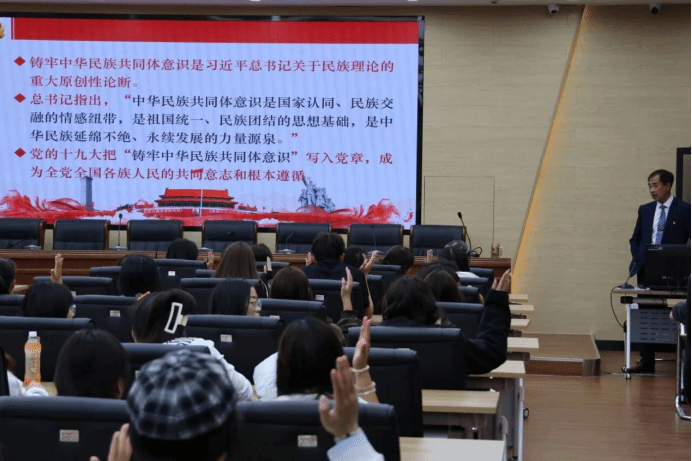 讲座中,屈原书记结合历史与现实、理论与实践,从中华民族共同体的形成历程、铸牢中华民族共同体意识的重大意义、新时代青年如何践行民族团结使命三个方面进行了系统阐述。他用生动的案例讲述了各民族在长期历史进程中相互依存、休戚与共的动人故事,强调学院作为人才培养的重要阵地,要始终将民族团结教育融入教育教学全过程,引导广大学生树立正确的国家观、历史观、民族观、文化观、宗教观,增强 “五个认同”。