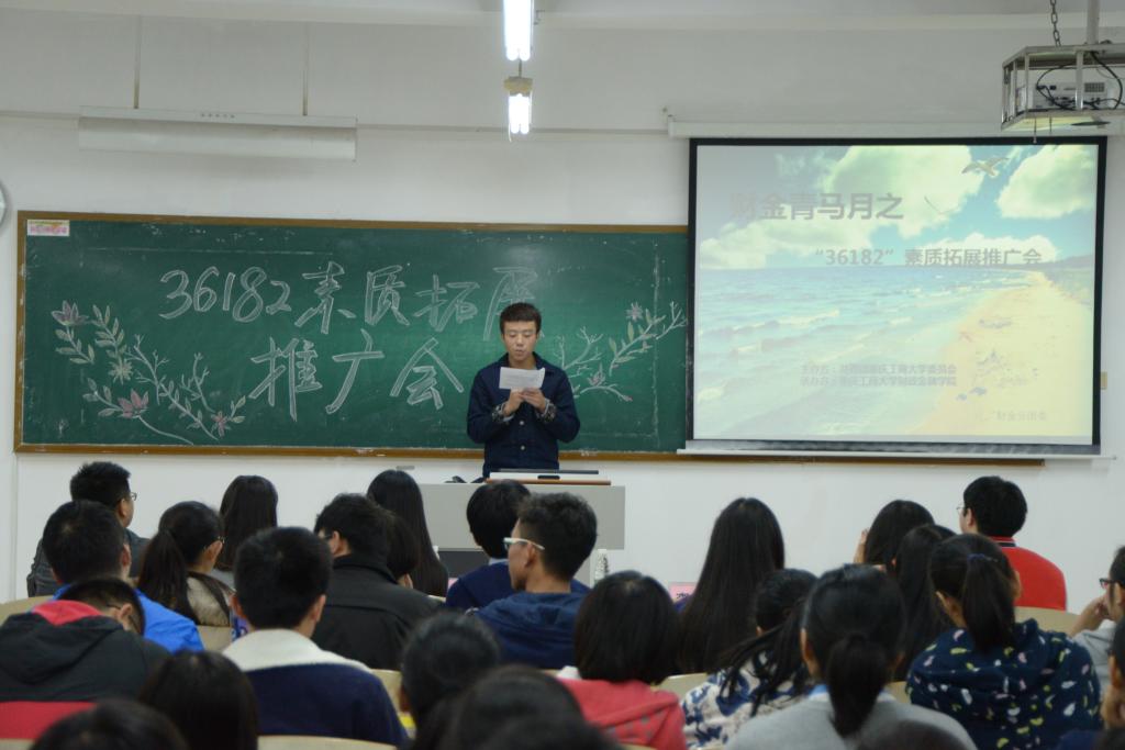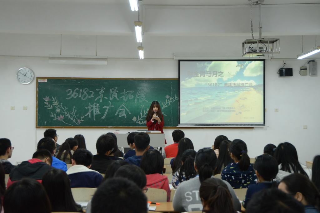 会议伊始,徐义配部长讲解了“36182”的简要内容与重要性,使同学们对此工程有一个初步了解。随后,何晓斌部长详细讲解“36182”工程的评优标准,并且从品格塑造人文陶冶,创业演练,科研实训和社会实践四方面详细解说素质拓展学分的加分细则。为了使同学们更加熟悉,部长将获得素拓分的步骤一一罗列,并对认证过程中的特殊问题进行了说明。随着同学们了解的增加,活动通过互动游戏更加深了同学们的素拓印象,使其在欢乐中学到更多的知识。在同学们的愉悦中,大会也接近了尾声,李超主席总结发言,强调开展素质拓展活动是希望学生走出宿舍,走出课堂,在课外增长才干与知识,实现素质拓展的真正意义。