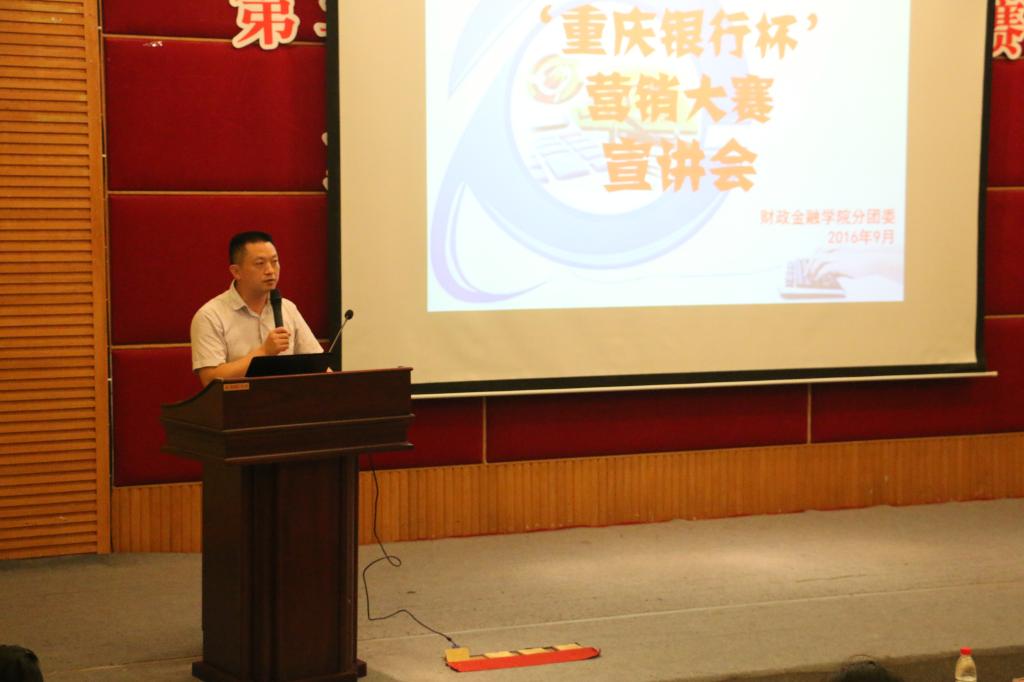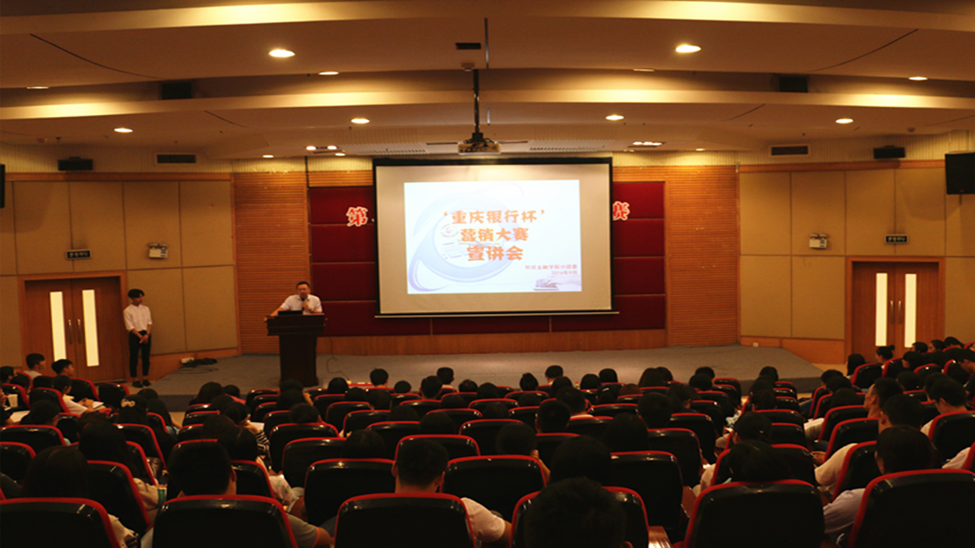为提升财金学子的综合能力,弘扬财金文化,彰显财金特色,9月23日下午2点,财政澳门信誉最好十大平台第六届“大学生金融节”之“重庆银行杯”营销大赛宣讲会在7200报告厅拉开帷幕。重庆银行个人银行部总经理陆勇、企业文化与公共关系部总经理助理丁晓、个人银行部产品开发及营销中心经理兼九龙坡广场支行行长助理叶嘉、财金学院党总支副书记刘代成、分团委书记徐阔出席本次宣讲会。