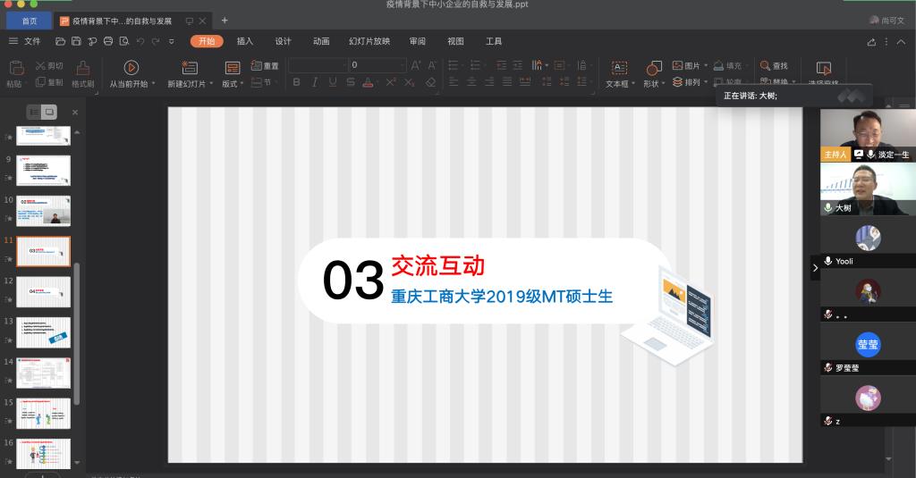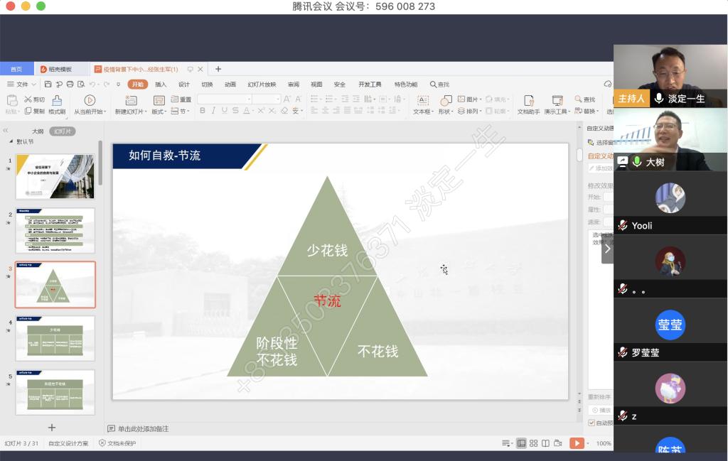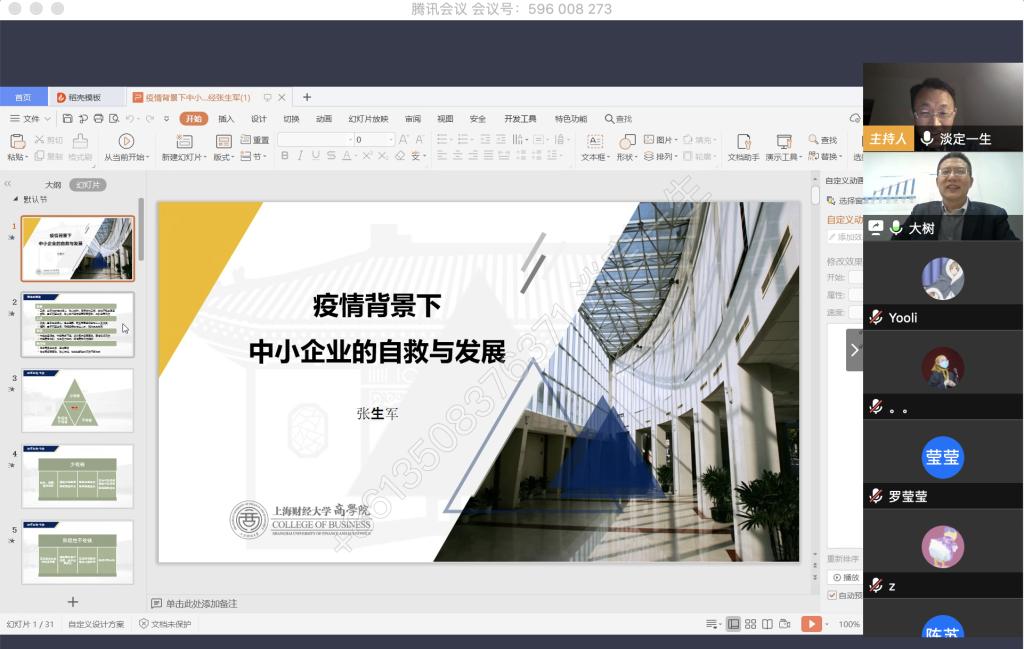 4月9日晚上,我校税务硕士教育中心通过腾讯会议成功举办了本年度第一次南山税务沙龙——疫情背景下中小企业的自救与发展。本次沙龙由澳门十大信誉网赌大全尚可文教授主持,特邀请迅驰车业江苏有限公司副总裁、上海财经大学硕士生导师张生军博士主讲,我校2019级税务硕士研究生参加了沙龙。