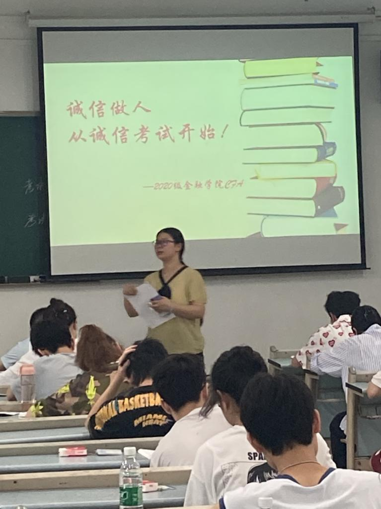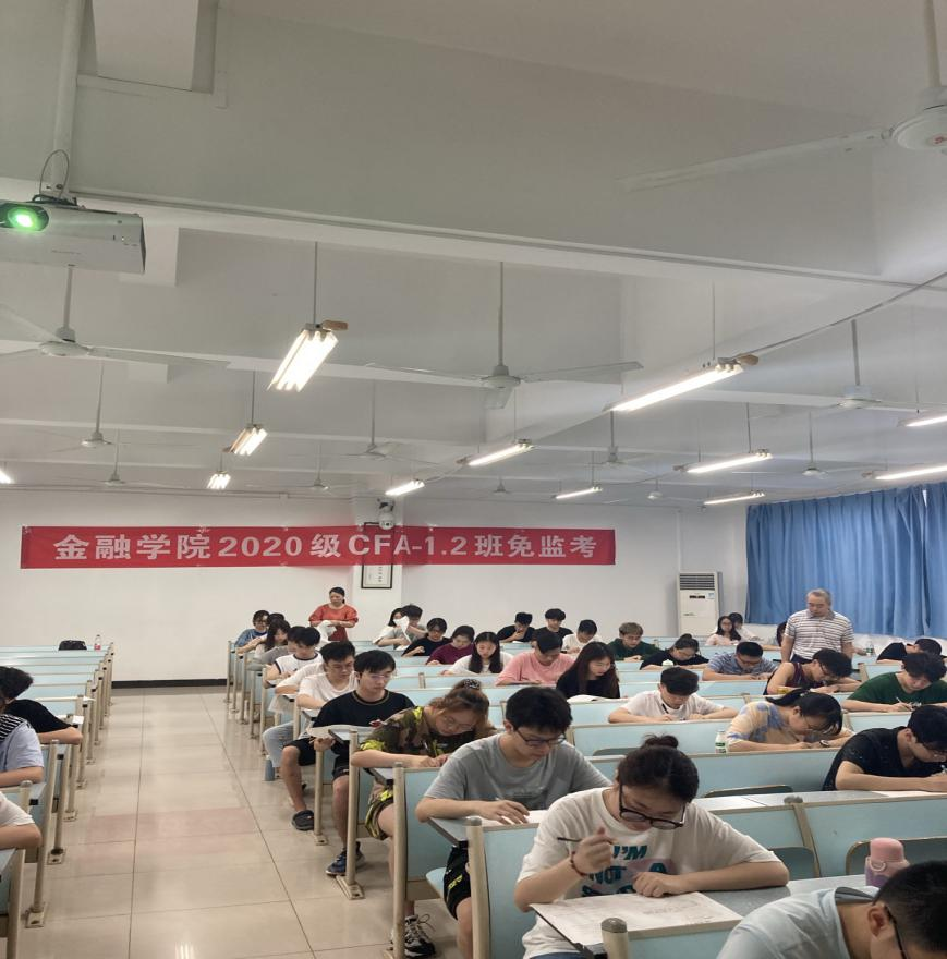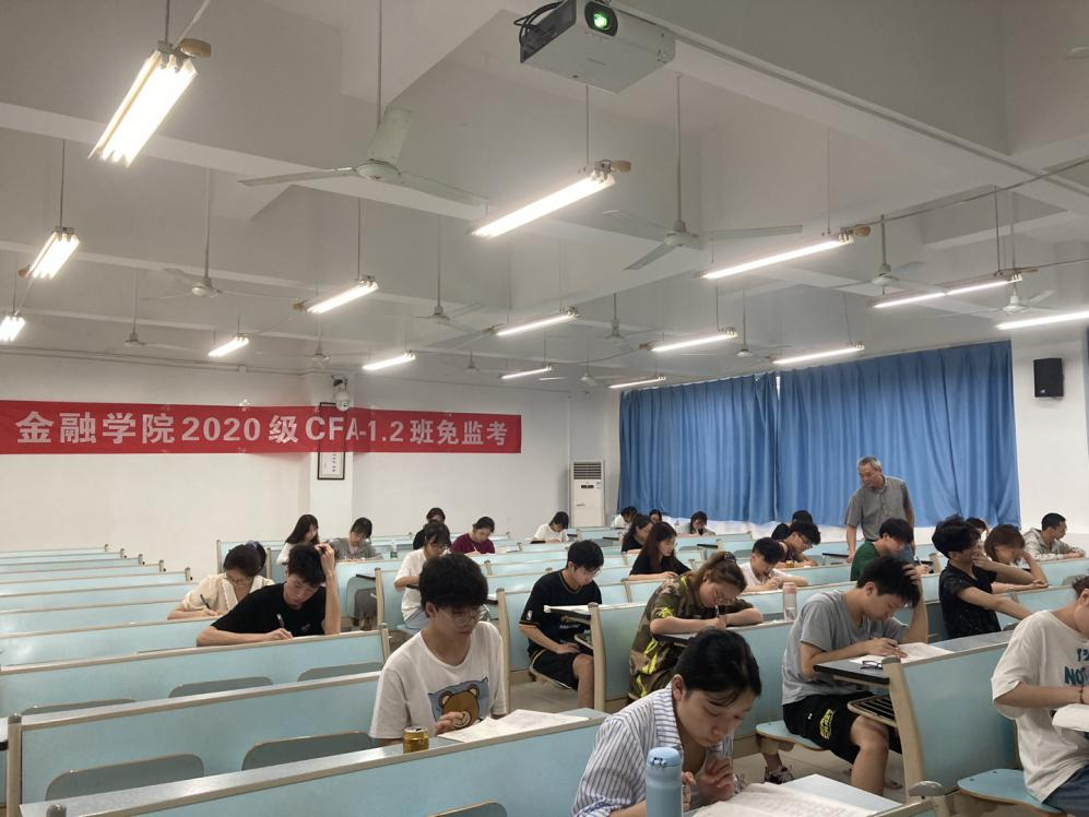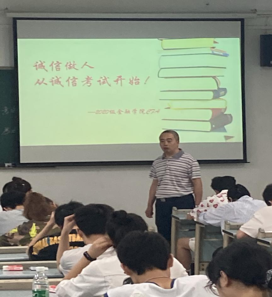 7月2日上午9:00,澳门信誉最好十大平台2020级CFA专业54名同学自愿申请在兰花湖校区20309教室践行了以“诚信做人,从诚信考试开始”为主题的《金融学》课程的“免监考”诚信考试。副校长李国军、教务处处长骆东奇、党委学工部副部长尹建平到场巡考。