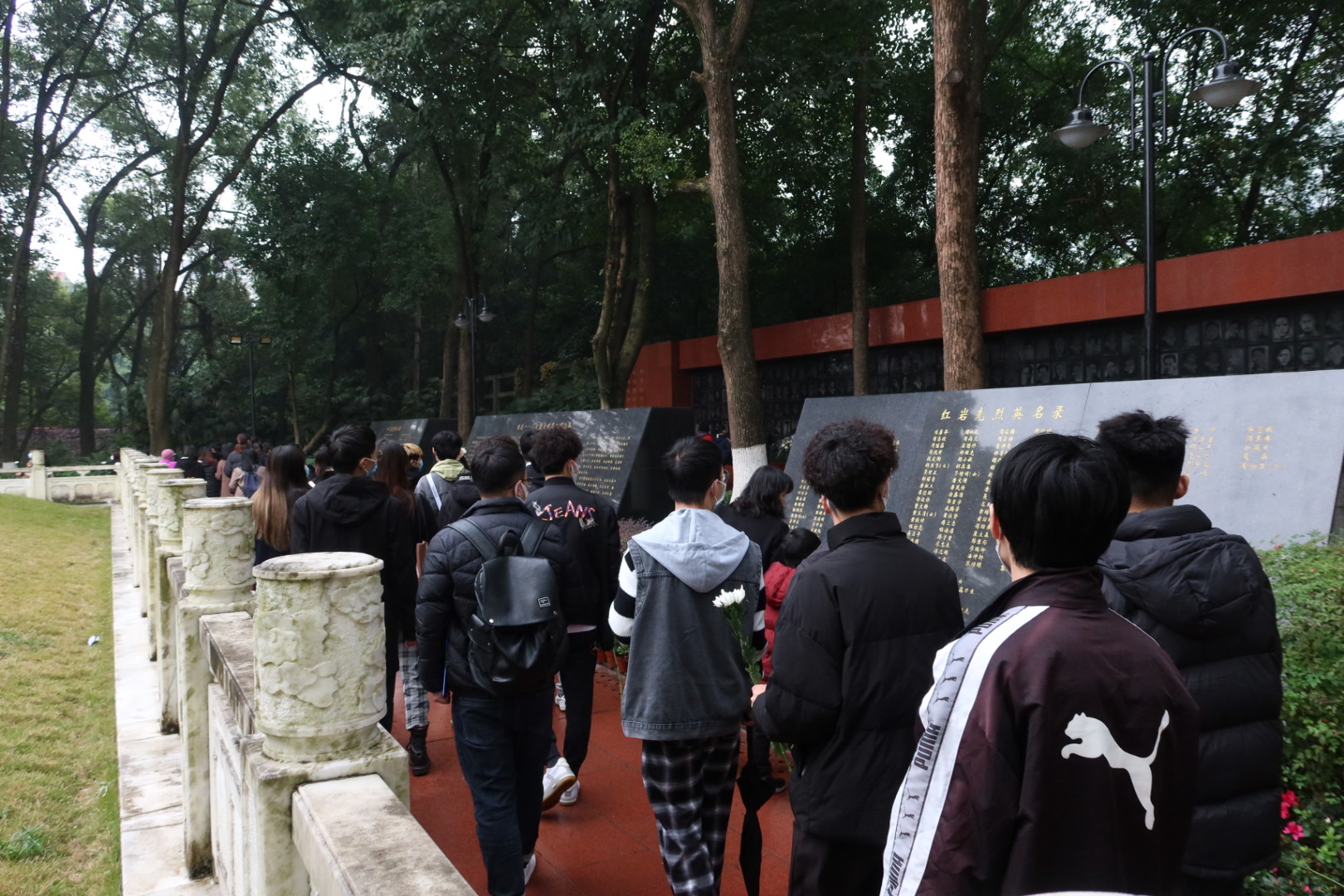 活动伊始,王兰讲述了“11.27”大屠杀惨案的悲惨经过及革命烈士英勇不屈的英雄事迹,她指出红岩精神是中国共产党和中华民族的宝贵精神财富,作为工商学子,同学们要铭记历史,传承红岩精神,珍惜来之不易的幸福生活,成长为国之栋梁。主持人介绍歌乐山烈士陵园并宣读祭文,表达出对牺牲的革命先烈们的崇高敬意。宣读完毕,全体成员默哀三分钟,缅怀革命先烈。默哀毕,青年代表诵读《红岩上红梅开》,讲述革命先烈的不朽传奇。而后,领誓人余超带领大家郑重宣誓。余新副书记带领大家有序向革命烈士敬献鲜花并向烈士墓碑鞠躬,她激励“红岩精神示范班”的同学们要牢记红岩精神“爱国、奋斗、团结、奉献”的八字内涵,争做优秀班级的排头兵,学以致用为中华民族伟大复兴贡献青春力量。扫墓活动后,同学们有序进入红岩魂陈列馆参观,在一张张图片和一件件文物中重温那一段段不朽的革命故事,厚植爱党爱国情怀。