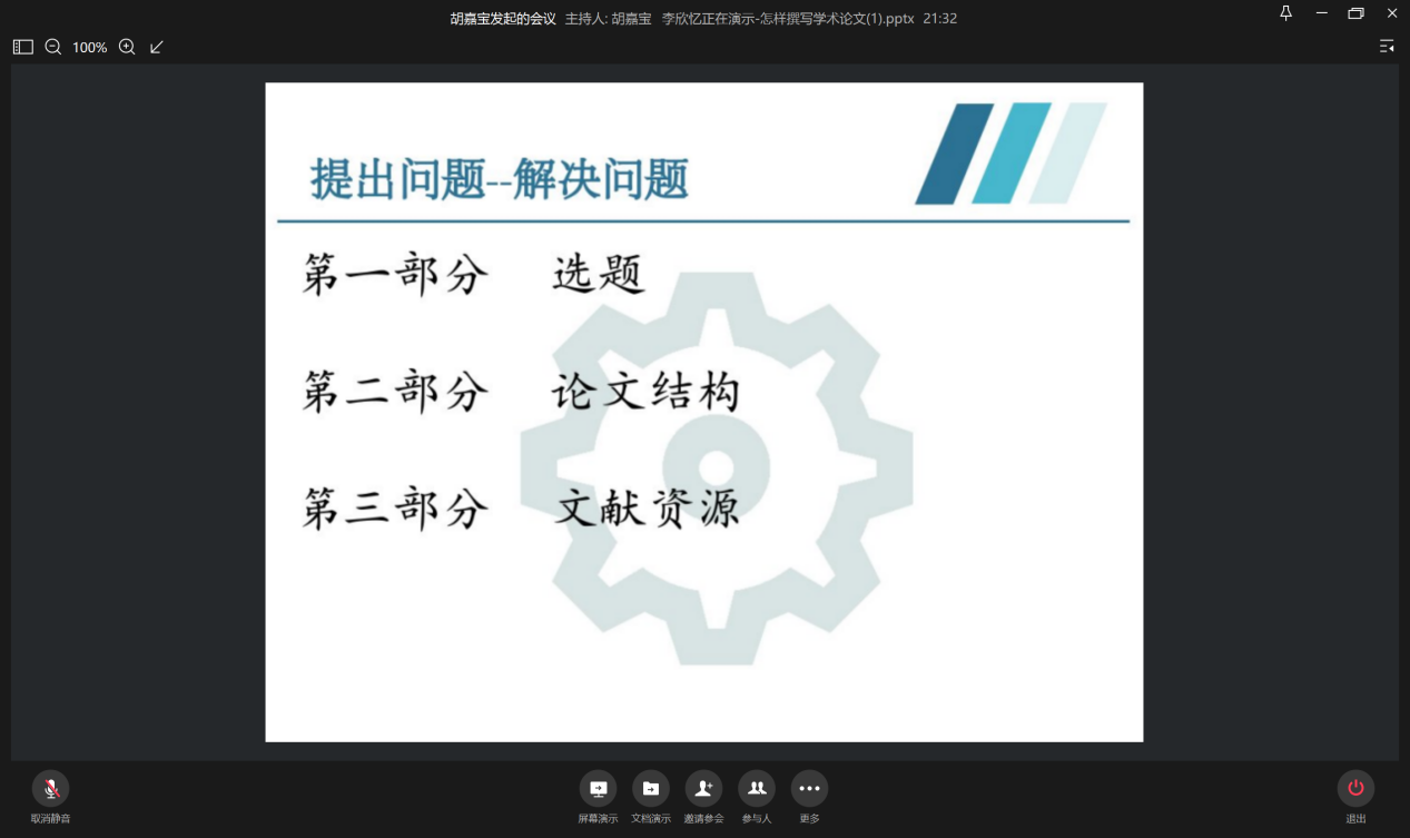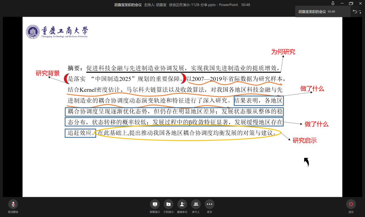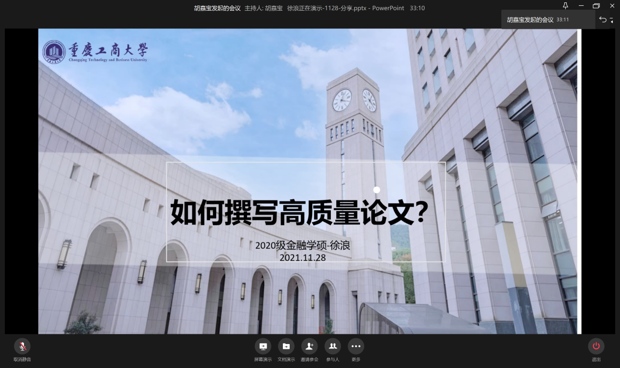 11月28日晚19:00,为提升学生论文撰写水平,营造良好的学术氛围,澳门信誉最好十大平台研分会在企业微信线上举行“如何撰写高质量论文”分享会。