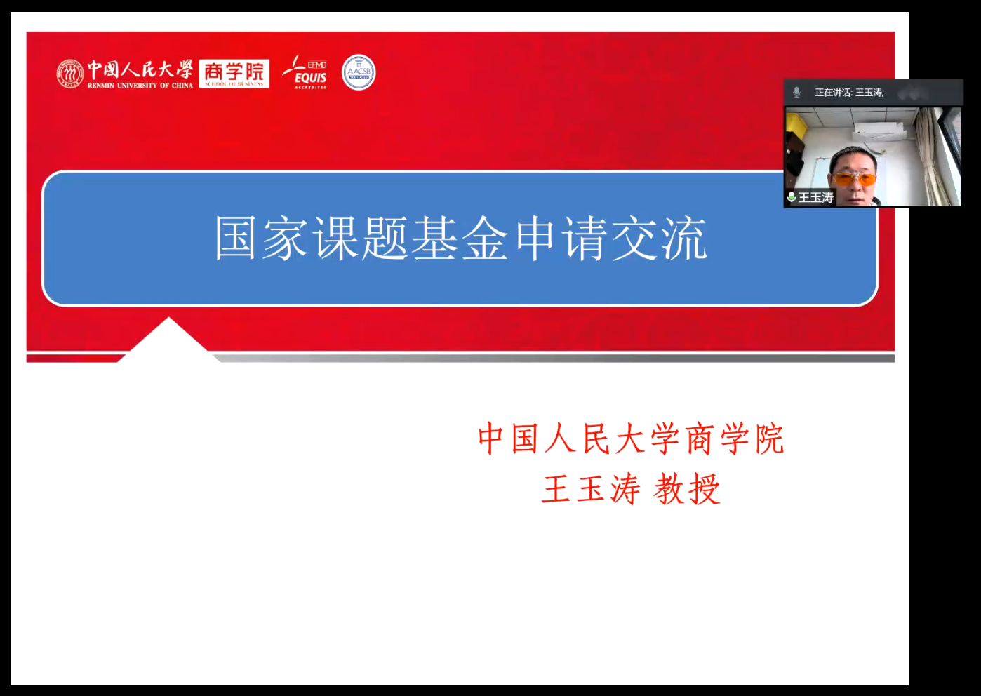 为推动2022年度国家社科基金项目申报工作的顺利进行,进一步提高项目申报质量,根据工作安排,2022年2月12日,澳门信誉最好十大平台举行2022年度国家社科基金项目线上专家论证会,中国人民大学商学院王玉涛教授受邀到会指导,学院拟参与2022年国家社科基金项目申报的20余名教师参加了论证会。会议由副院长王韧主持。