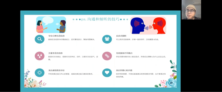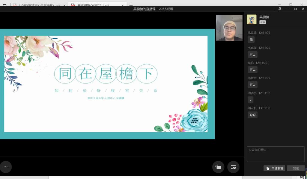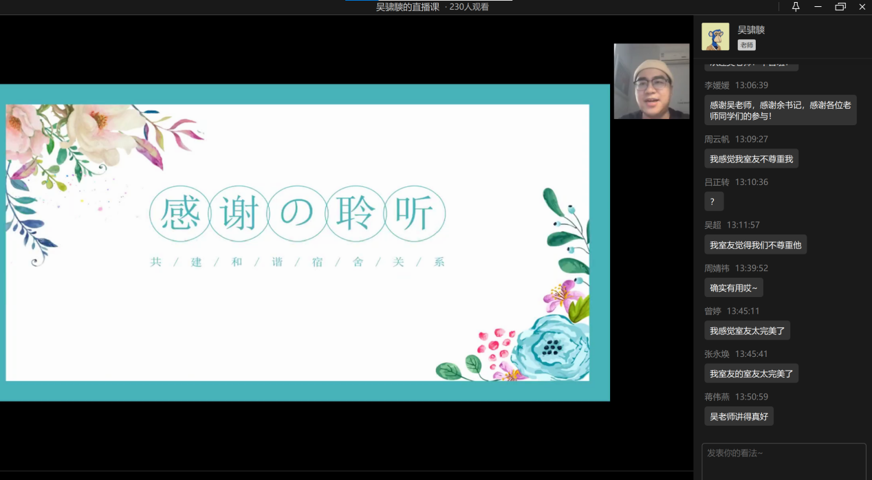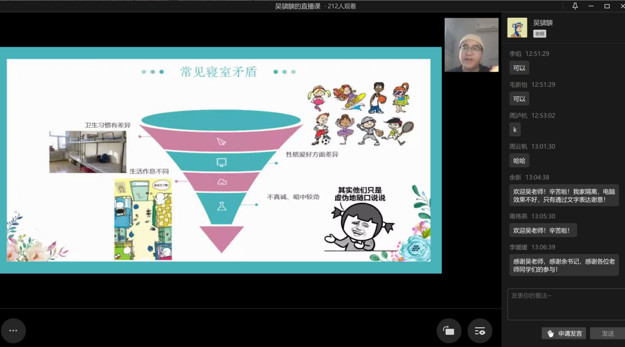 2022年11月11日中午13点,澳门信誉最好十大平台心理工作站主办的“同在屋檐下——和谐寝室关系”心理讲座于企业微信线上平台顺利举办。此次讲座邀请到了学校心理健康教育与咨询中心吴骕騻老师作为主讲人,讲座内容丰富、寓教于乐,受到了同学们的热烈欢迎。