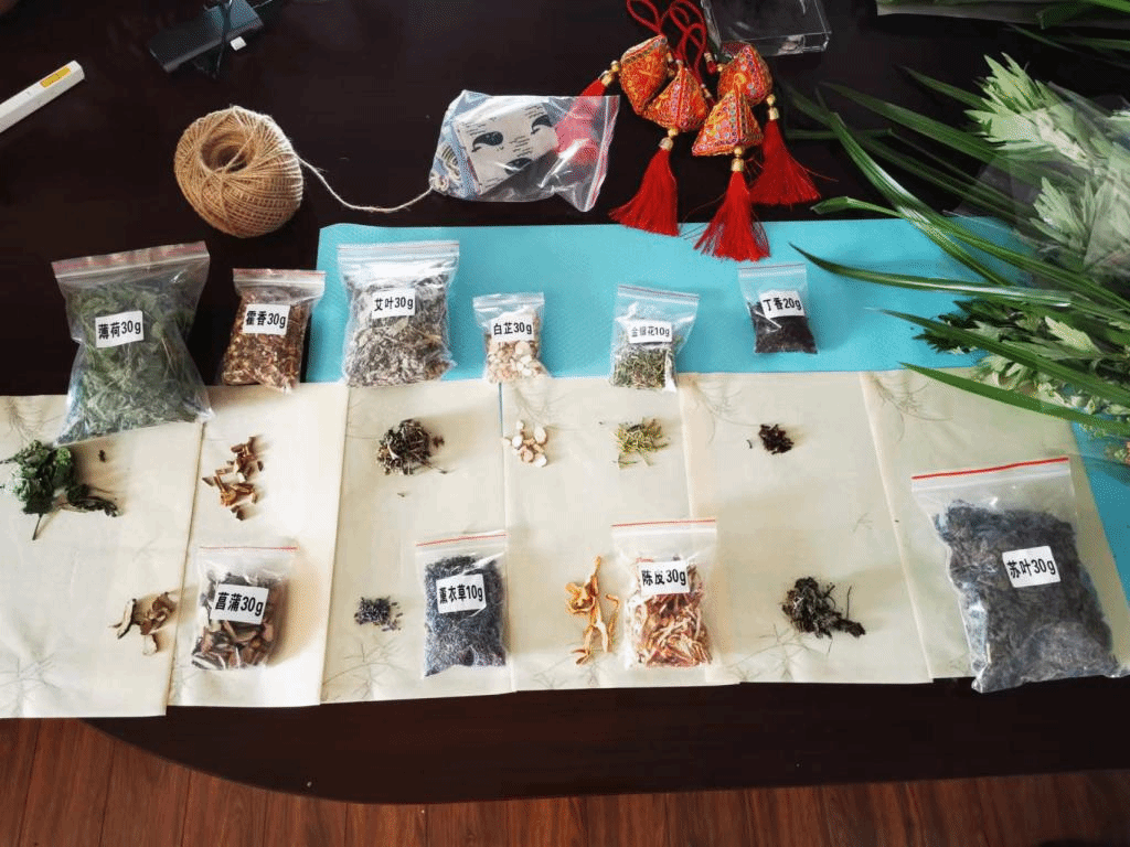 “制香囊”是同学们最感兴趣的环节,大家在老师的带领下不仅认识了麝香、艾草、白芷、苏叶、薄荷、等天然中草药,同时根据自己的喜好将不同比例的药材放入布包制作成了味道各异的香囊。