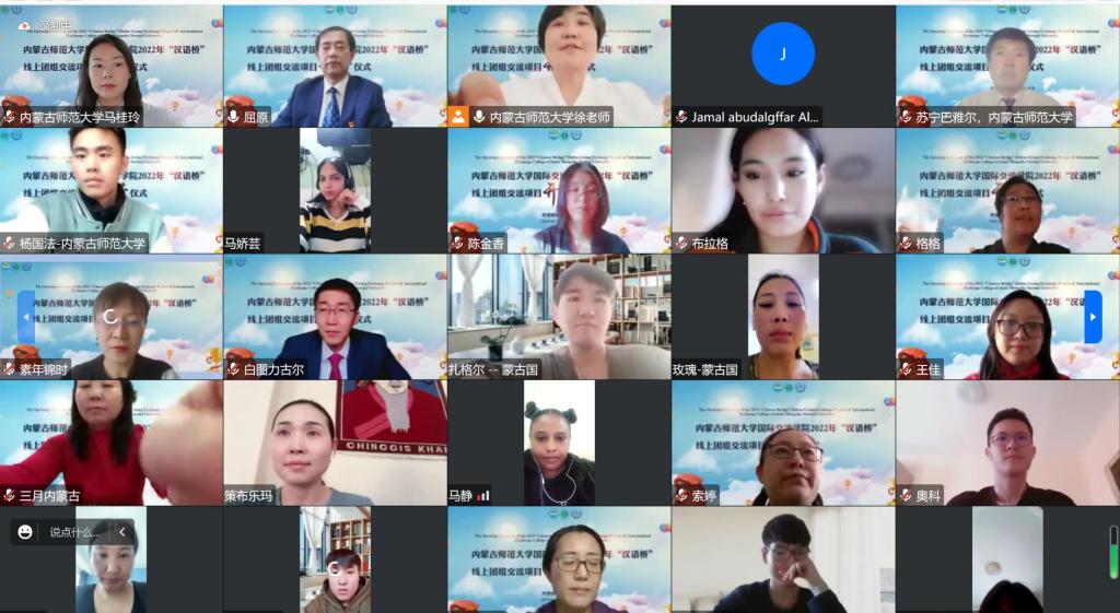 2023年1月2日,由教育部中外语言交流合作中心主办,beat365beat365英国官方网站承办的2022年“汉语桥”线上团组项目开营仪式正式举行。beat365英国官方网站党委副书记张海峰、国际交流合作处副处长苏宁巴雅尔、beat365英国官方网站党总支书记屈原、beat365英国官方网站院长武海燕、beat365英国官方网站党总支副书记副院长白图力古尔、beat365英国官方网站副院长张磊、任课教师及相关工作负责人员出席了开营仪式。来自俄罗斯、蒙古国、巴基斯坦、阿尔及利亚、柬埔寨、摩洛哥、沙特阿拉伯、老挝、苏丹等九个国家100余名汉语桥学员和老师相聚在云端。beat365英国官方网站党总支书记屈原主持了开营仪式。
