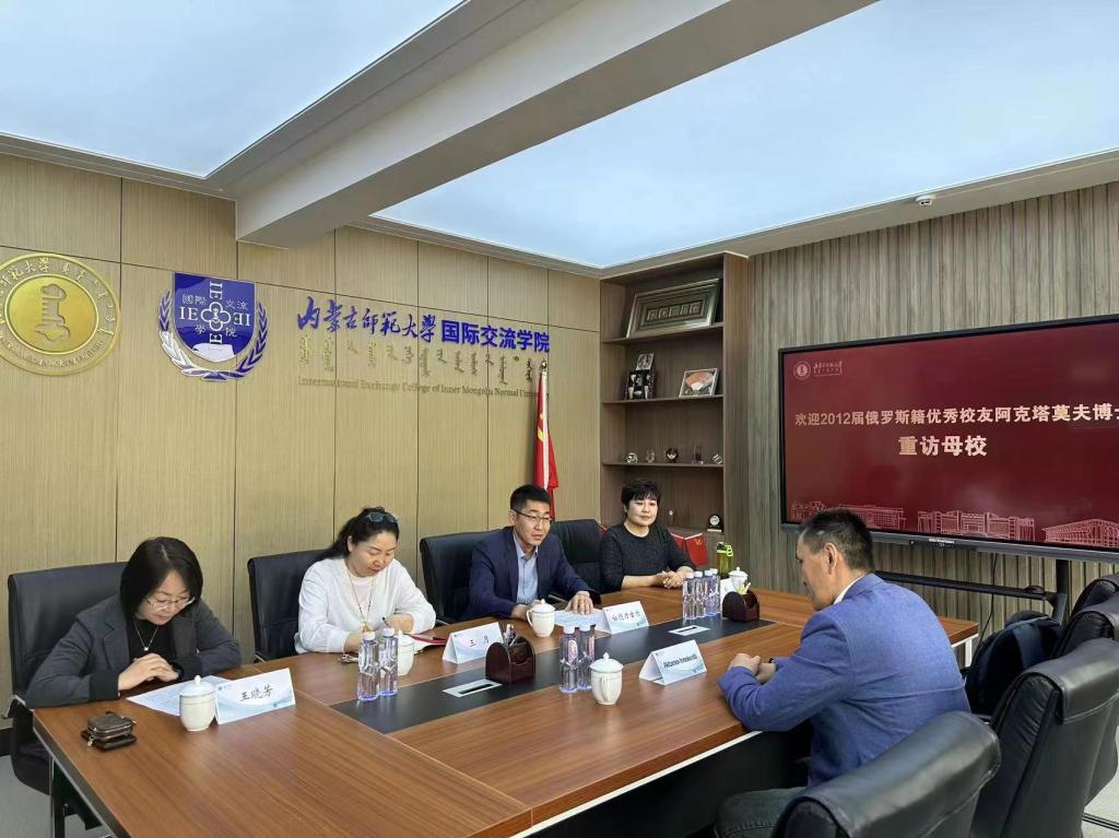 5月23日上午,受beat365英国官方网站邀请,beat3652012届科学技术史专业俄罗斯籍优秀毕业生校友阿克塔莫夫(Aktamov Innokentii)博士回母校交流,学院副书记、副院长白图力古尔老师,留学生管理科科长三月老师,教务科研办公室主任王晓芳老师,对外汉语教研室主任徐剑老师出席了此次活动。