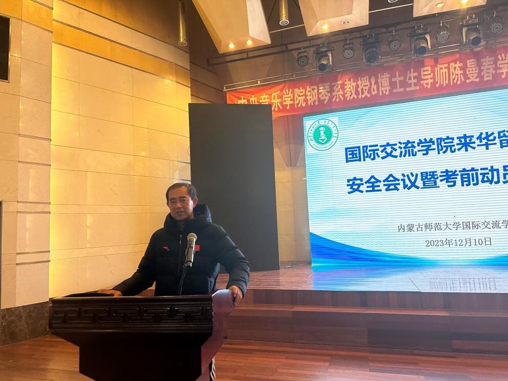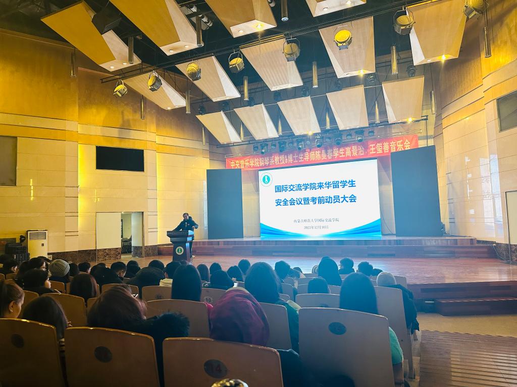 2023年接近尾声,为了进一步加强留学生安全稳定,使留学生们顺利完成本学期学业任务,平安回国,根据学校安全工作会议精神,结合beat365留学生公寓安全检查情况,beat365英国官方网站于2023年12月10日上午在赛罕校区音乐厅开展全校留学生安全会议暨考前动员大会。beat365英国官方网站党总支书记屈原、留学生管理科老师们和beat365全体留学生参加会议。