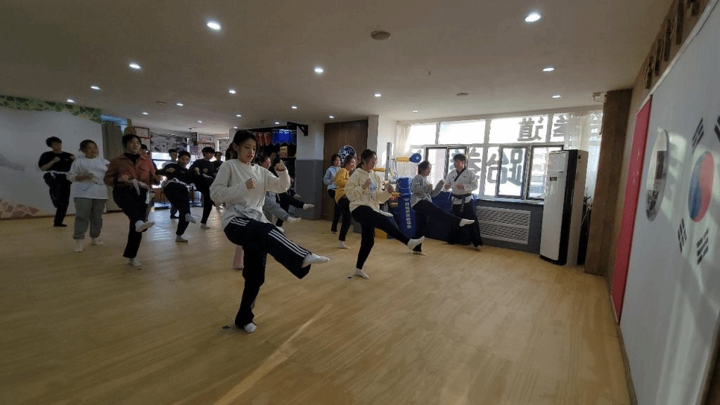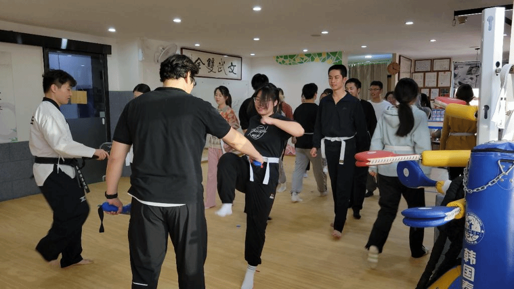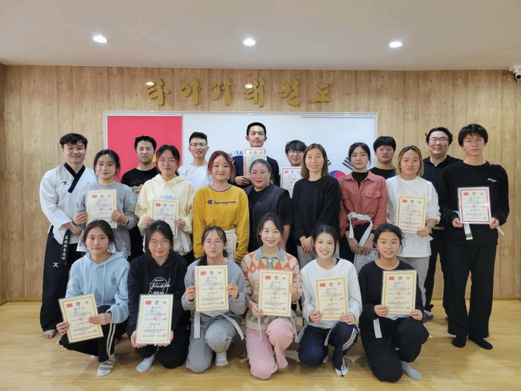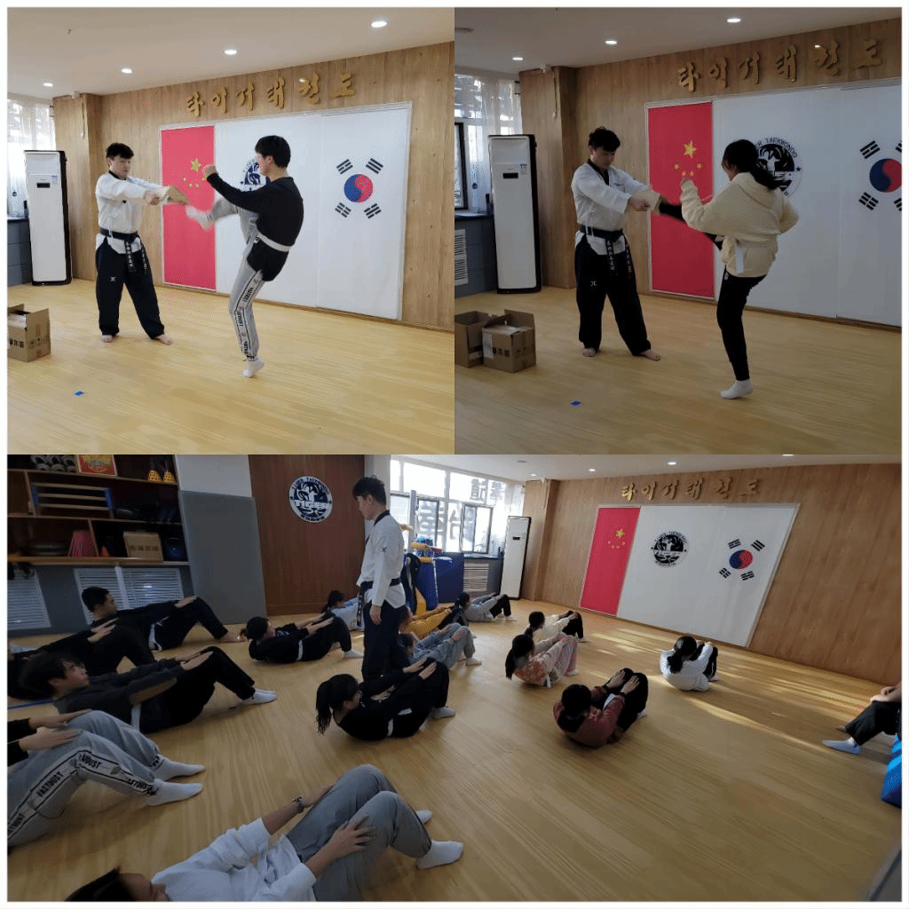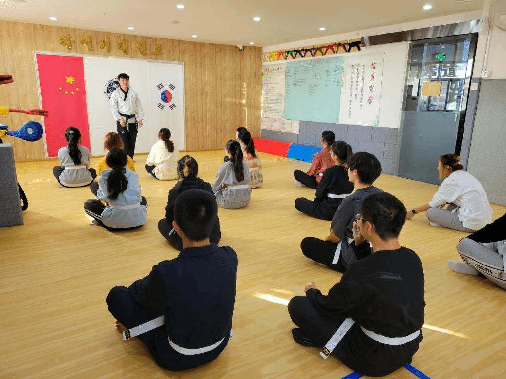 11月21日下午,beat365英国官方网站韩国语系金泽洙、朴贞淑同乌日勒老师带领着2022级学生来到泰格跆拳道馆,参加了跆拳道体验活动。首先,韩国籍跆拳道馆馆长金必中为同学们分发写有大家韩文名字的道带,之后详细讲解了跆拳道的不同流派,并带领同学们一起做体能和柔韧训练,为学习跆拳道做好了热身准备。接下来,金馆长向同学们教授了几个跆拳道的基本动作,并进行训练,训练结束后,同学们体验了跆拳道考级和脚踢木板。在活动的最后,金馆长为同学们颁发了跆拳道活动体验证书,并合影留念。