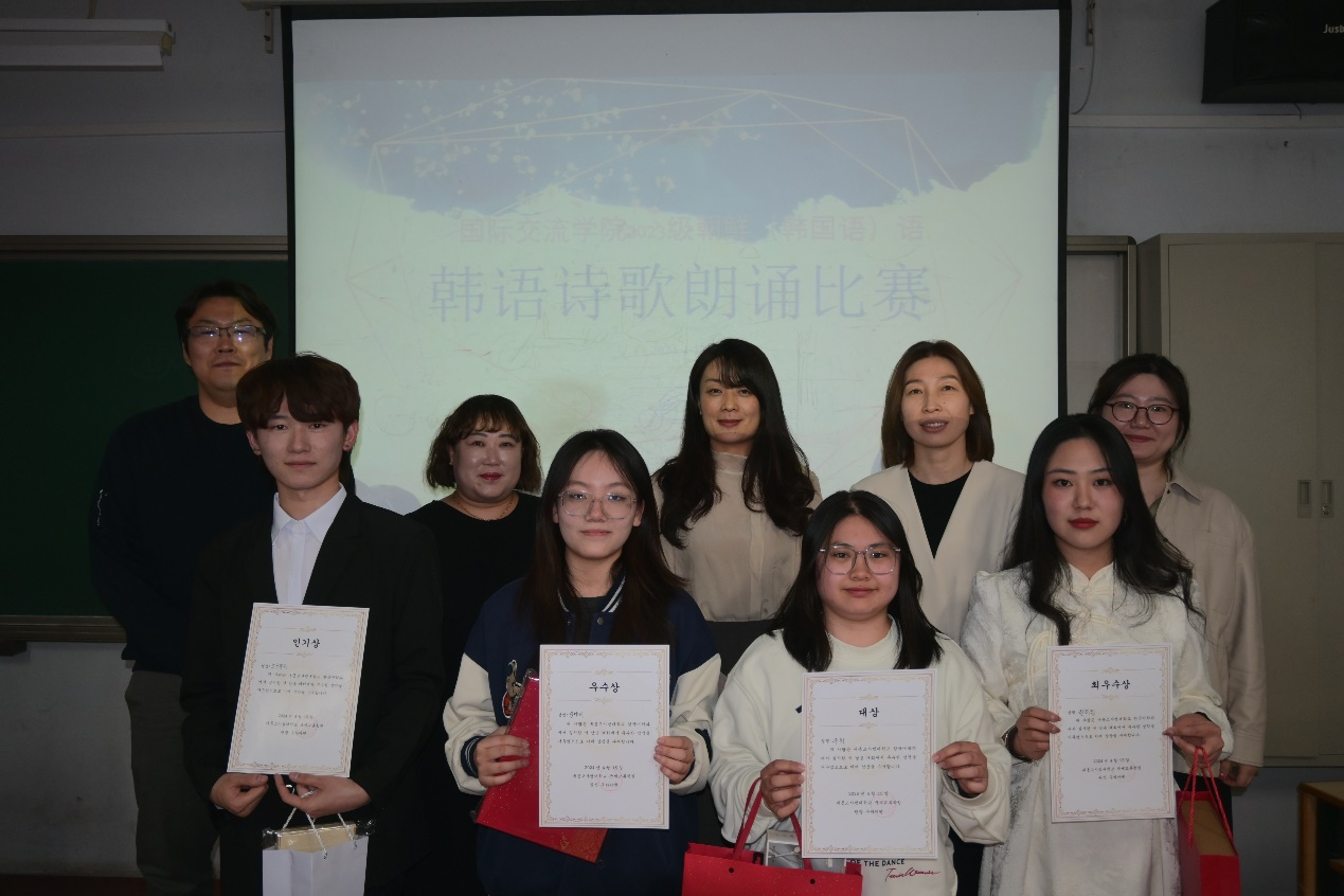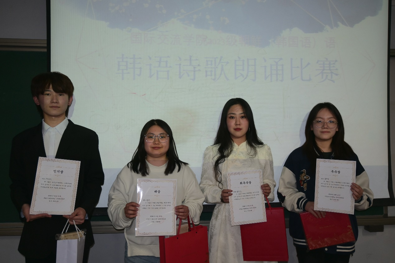 经过紧张而激烈的角逐,苏禹凭借作品《시작》荣获一等奖;林莉婷以作品《인생도계절이있어요》摘得二等奖;格根珠腊和孙雅妮分别凭借《길》和《흔들리며피는꽃》荣获三等奖;邹忠旭则因作品《예전엔미쳐몰랐어요》获得人气奖。其他参赛同学也获得了参与奖。评委老师们为获奖同学颁奖,并向他们表达了衷心的祝贺。