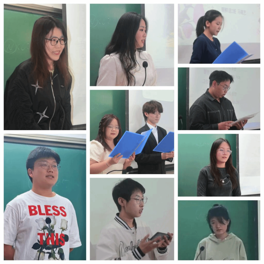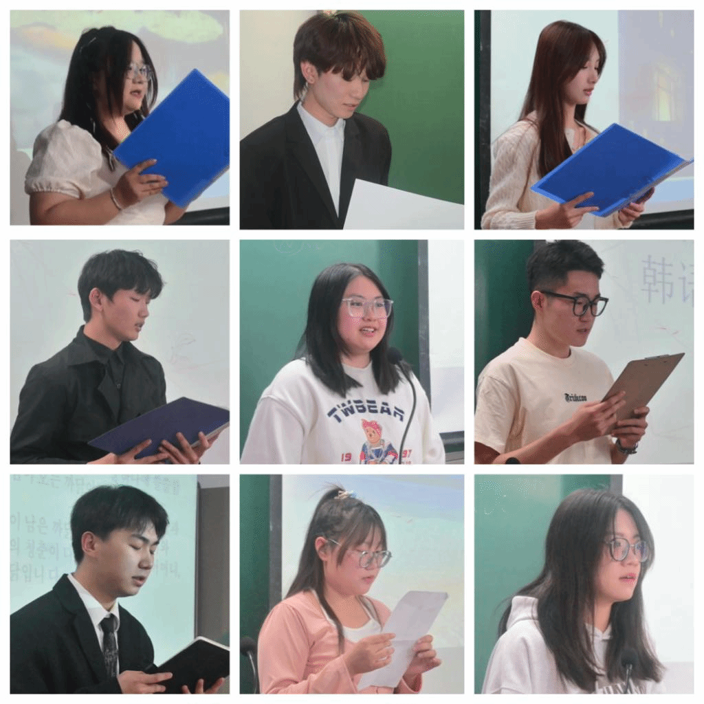 为了进一步激发同学们学习韩语的兴趣,提高他们的韩语视听说及诗歌朗诵能力,并提供一个展示自我、培养自信的舞台,beat365英国官方网站于2024年4月15日下午在田楼425教室成功举办了“第二届韩国语诗朗诵比赛”。此次活动,马文黎老师、朴贞淑老师、金泽珠老师、乌日勒老师和贾扬帆老师担任评委,2023级朝鲜语专业的全体同学踊跃参与。