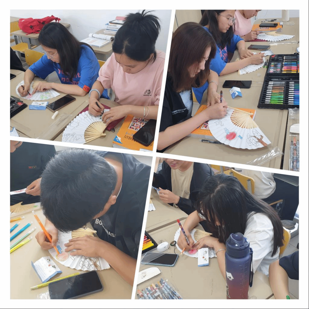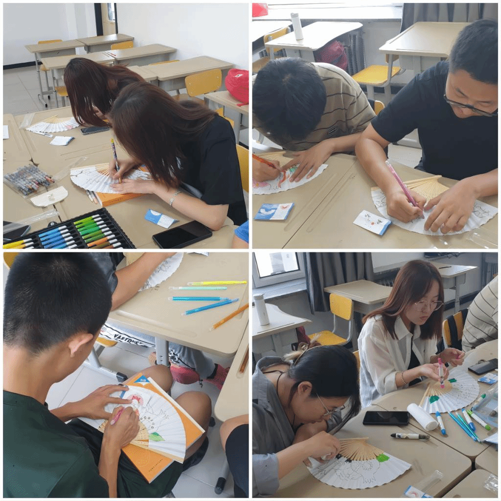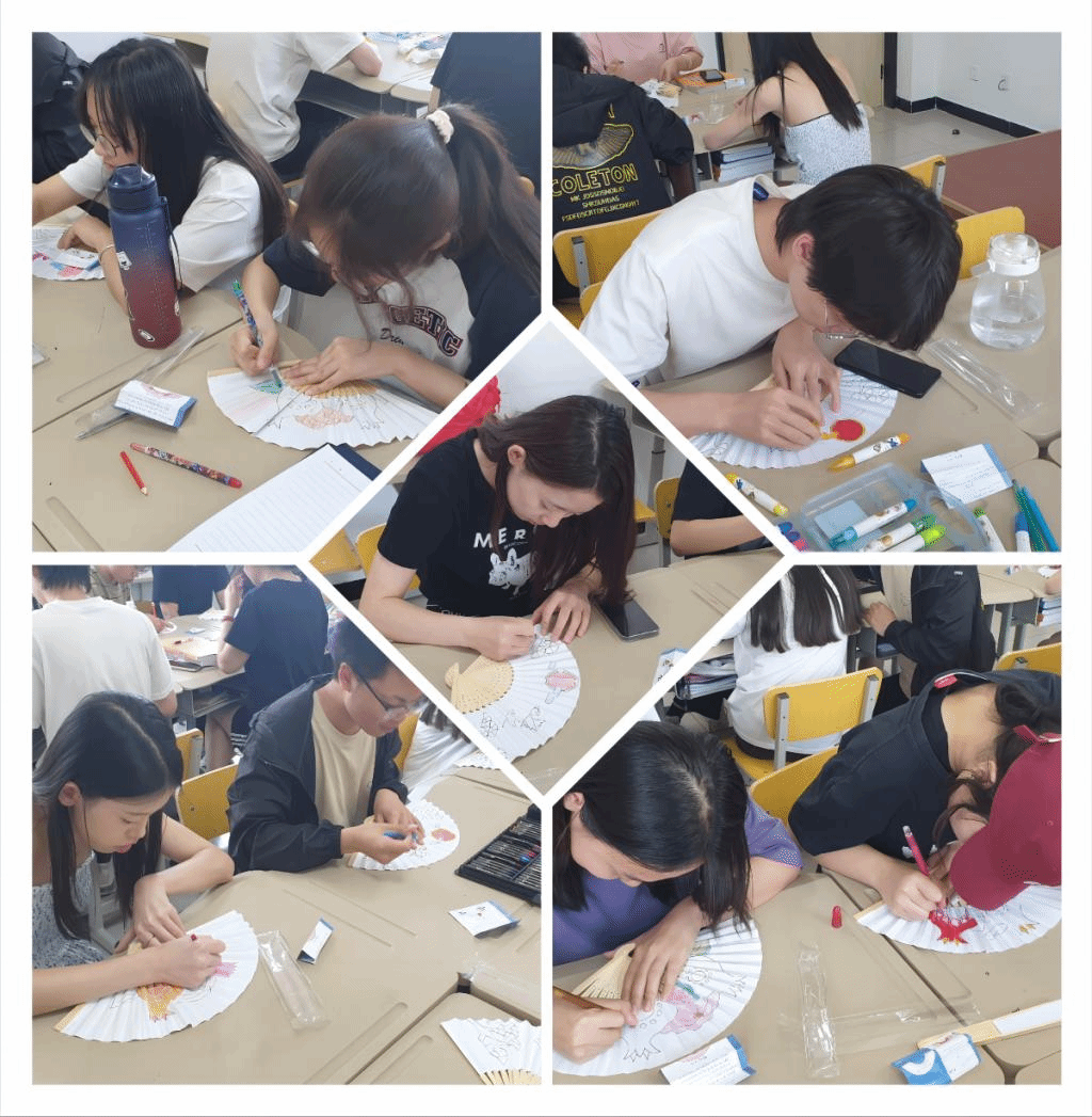 活动伊始,金老师耐心地为同学们讲解了韩国传统扇子上各种图案所蕴含的文化内涵,并比较了中韩两国传统扇子的异同。随后,他把同学们分为两大组,分发绘画工具,进行绘画。活动过程中,老师全程在旁指导同学们,最后为同学们拍照留念。