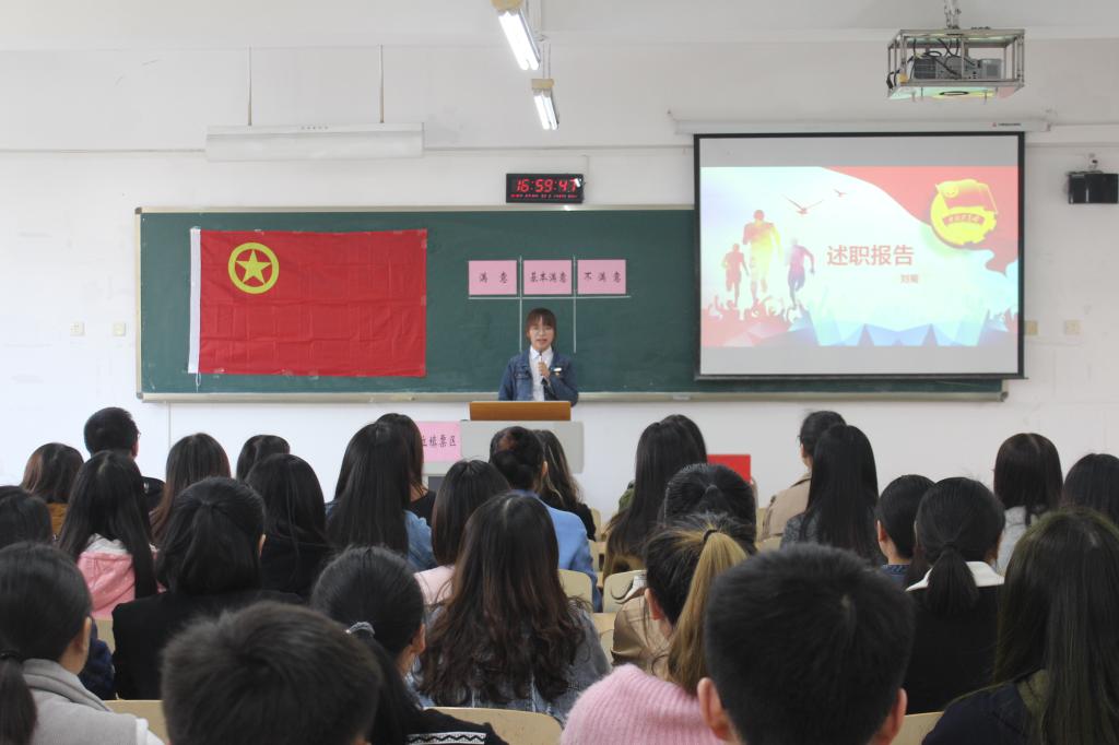 首先,刘菊同学为大家做了简短的述职报告。2017-2018年期间,在刘菊同学的带领下,以及团支部成员的配合下,上一学年的团支部干部公推直选活动、申报“全国活力团支部”并成功入选、“党的十九大精神专题学习”网络竞赛活动等工作都取得了良好的成效。此外,刘菊更是表示,要进一步加强思想引领,创新开展各项党团支书宣传实践活动,严于律己,以身作则。