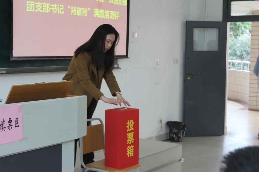 在接下来的“背靠背”满意度测评投票中,刘菊同学以37票的满意和仅4票的基本满意通过了此次测评,这也是对她这一年的努力工作的肯定,同时出现的4票基本满意也将是刘菊同学今后工作努力的方向和动力。之后徐阔老师也对刘菊同学本年度的工作表示肯定,希望她能继续以提升思想觉悟为基础建设,培养更多的优秀团员。