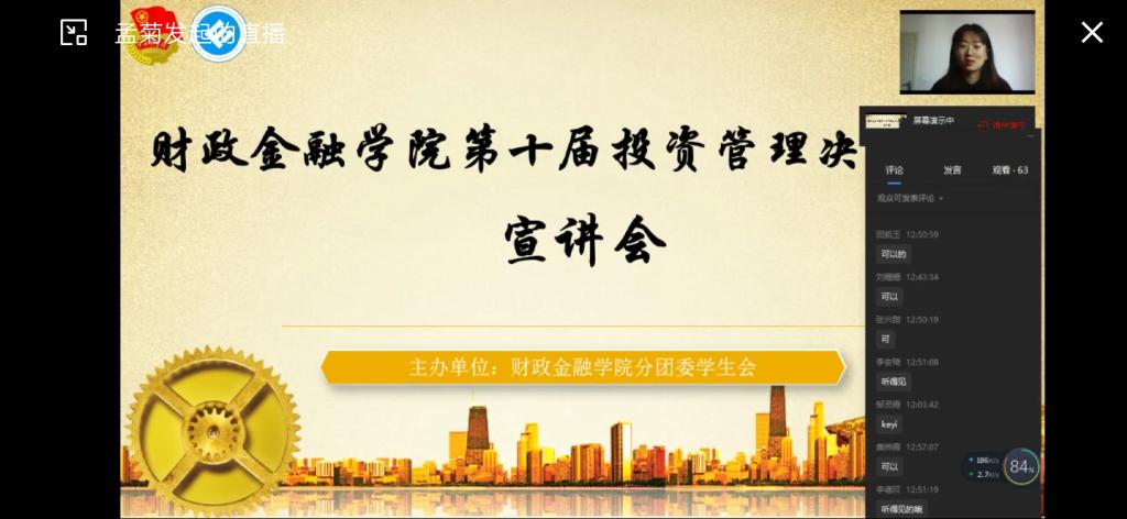 在梁佳锐同学进行经验分享的过程中,同学们也在评论区积极讨论,表现出对于此次大赛的热情。通过宣讲会,同学们对于投资管理决策大赛的整体流程和具体细节都有了详细的了解,也预祝各参赛队伍能在接下来的比赛中取得优异的成绩!