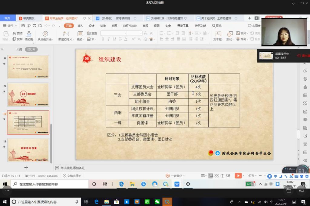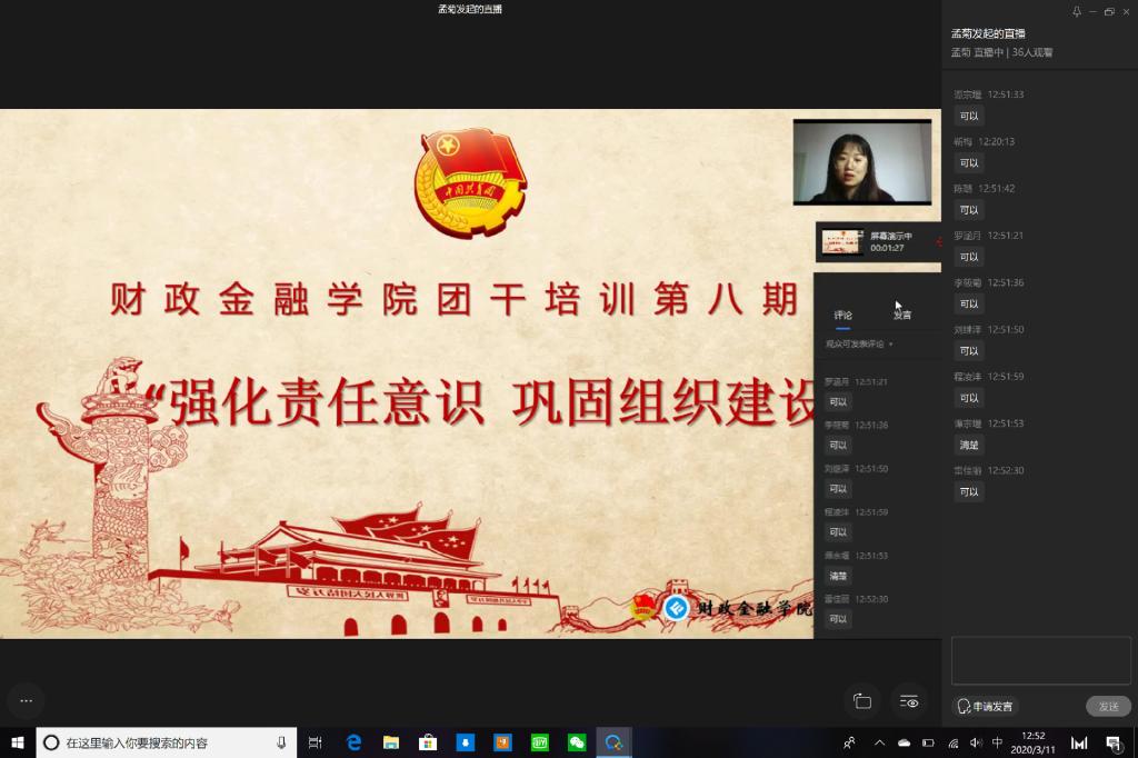 受疫情影响,财政澳门信誉最好十大平台于2020年3月11日在企业微信线上平台成功开展主题为“强化责任意识,巩固组织建设”的第八期团干培训活动。17、18级各班以及19CFA的团支书参与了此次培训活动。