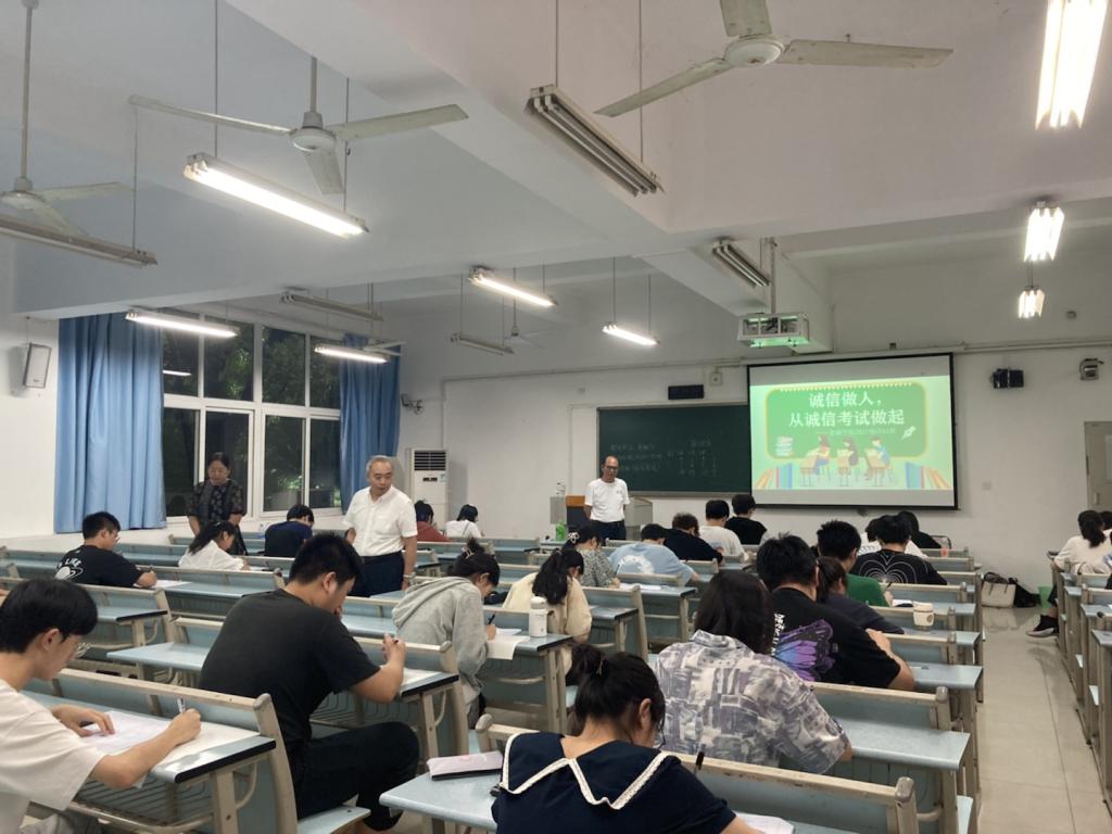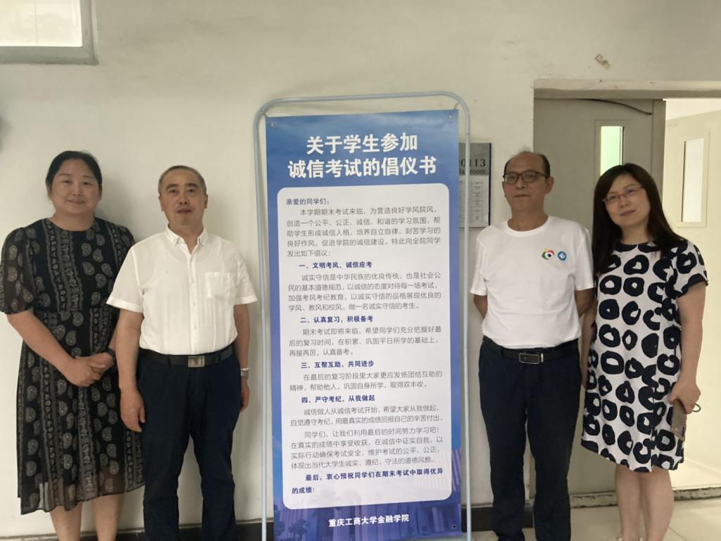 2022年6月23日下午,澳门信誉最好十大平台在兰花湖校区20113教室开展第四届“免监考”诚信考试,持续推动考试思政,营造优良学风和诚信考风。参加本次“免监考”的班级为21CFA1班,考试科目为《金融学》。教务处处长骆东奇、副处长韦晓兰,澳门信誉最好十大平台党委书记、副院长王建明,党委副书记、院长王兰,党委副书记、纪委书记余新到场巡考。
