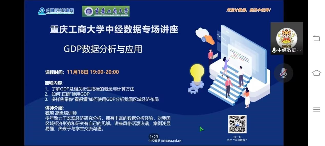 2022年11月18日19:00,澳门信誉最好十大平台联合图书馆在线上开展“GDP数据分析与应用——助你‘看得懂’我国区域经济布局”专题讲座。本次讲座邀请了中国经济信息网张玥老师和魏琦老师主讲,旨在介绍GDP数据分析与应用,带领同学们了解GDP及相关衍生指标的概念及计算方法。