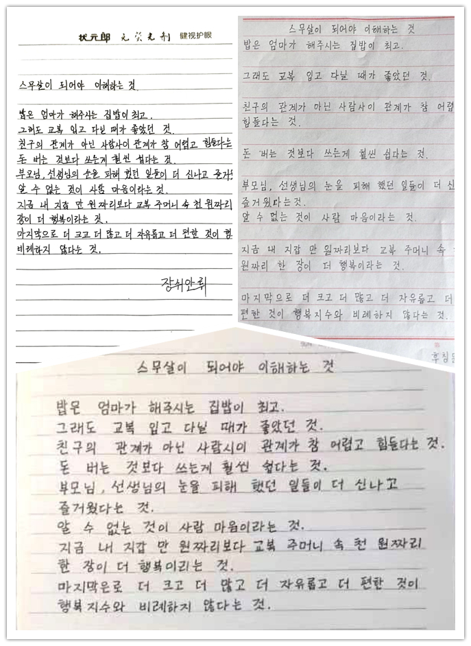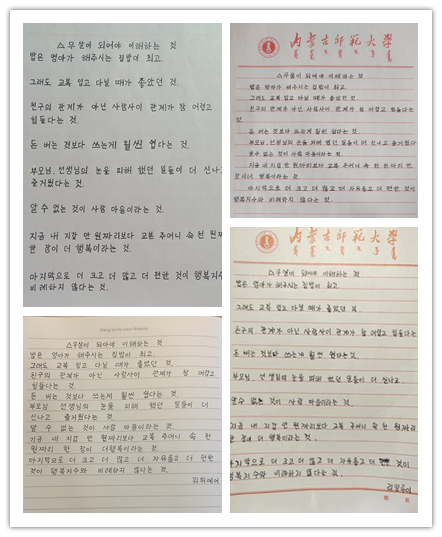 活动开始一周前,马文黎老师给学生讲解了韩文书写的要领与注意事项,并将韩文字帖发下去供学生进行临摹。活动结束后,由马文黎,乌日勒,哈斯,朴贞淑和金泽洙五位教师对学生的作品进行投票,最终评选出11部优秀作品,具体的获奖名单如下: